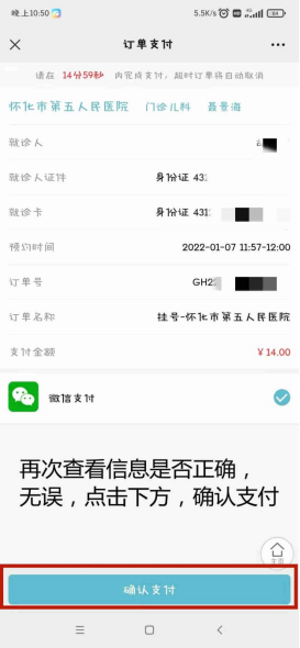 打开怀化市第五人民医院公众号,点击就诊服务,点击门诊缴费,选择就诊人,点击查询,点击确定并提交支付。