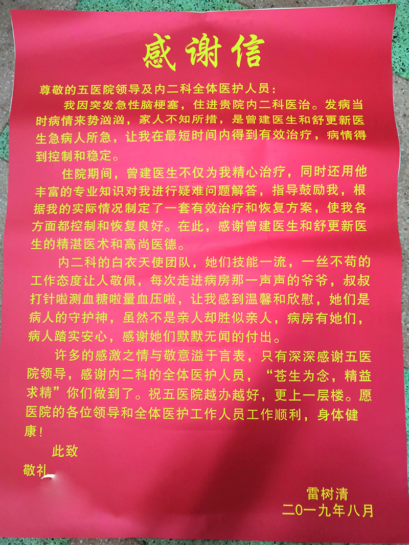 雷树清的感谢信